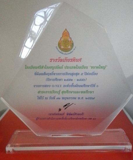 โล่รางวัลโอเน็ตค่าเฉลี่ยสูงสุด 5 ปีติดต่อ กลุ่มสาระการเรียนรู้สุขศึกษาและพลศึกษา